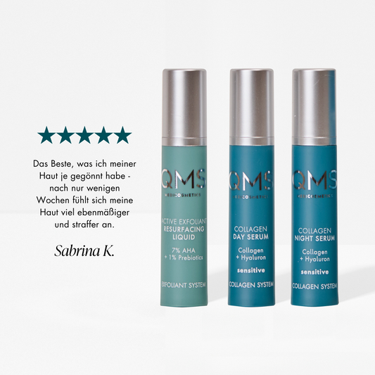 Doux mais hautement efficace – c'est notre soin pour peaux sensibles. Ta peau réagit rapidement aux influences extérieures et tu cherches depuis longtemps le nettoyage du visage, la crème ou le soin intensif optimal ? QMS propose des solutions innovantes et efficaces pour le soin des peaux sensibles. Avec des ingrédients apaisants, protecteurs et améliorants de la peau tels que 97 % de collagène identique à la peau et acide hyaluronique, nous soutenons la barrière cutanée et améliorons l'apparence de la peau visiblement et durablement. Découvre maintenant les produits premium sensibles de QMS Medicosmetics – avec une efficacité scientifiquement prouvée, pour une tolérance cutanée maximale et des résultats palpables.