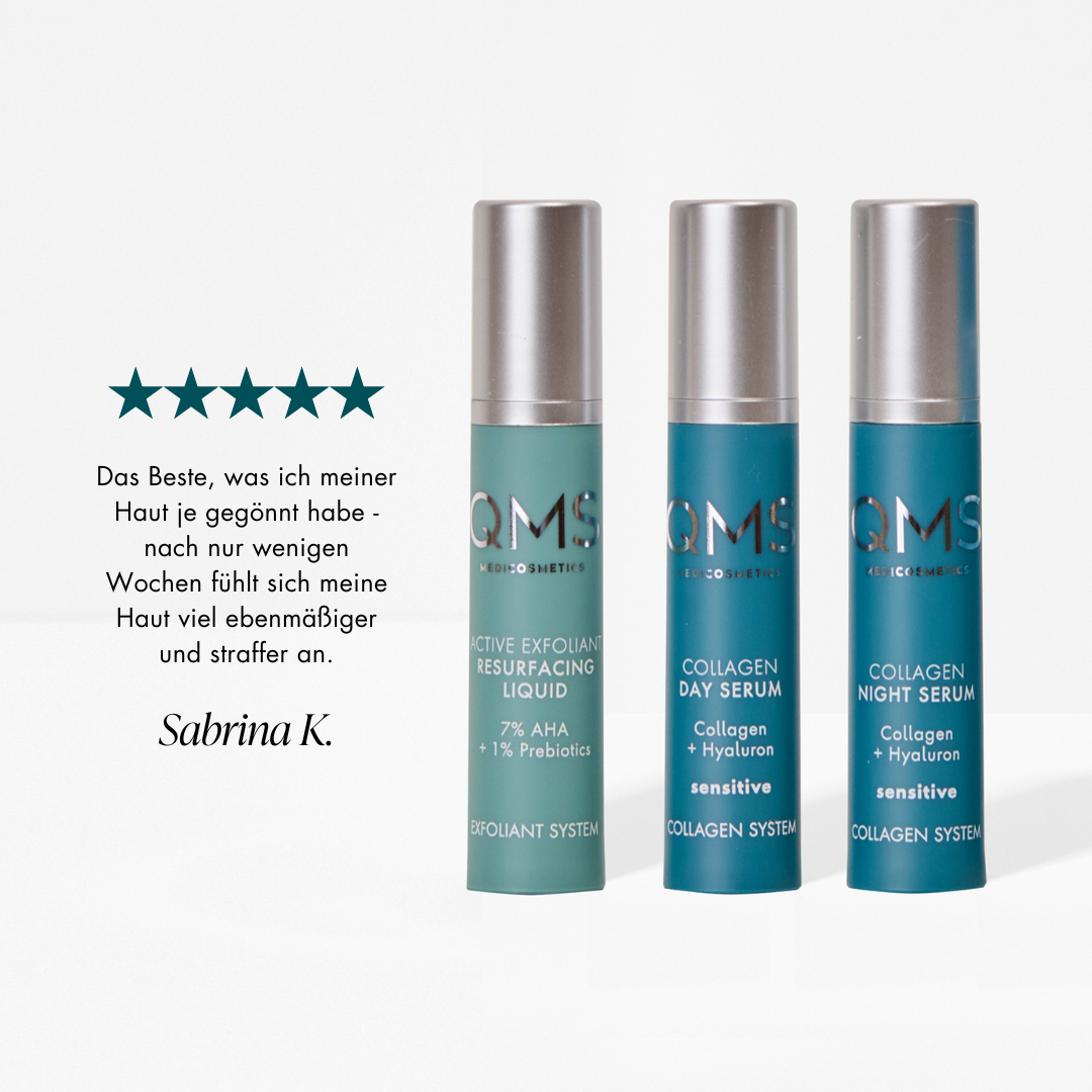 QMS fait partie des icônes de la cosmétique de luxe médicalement fondée. La marque représente des soins de la peau à haute performance cliniquement prouvés avec jusqu'à 97% de collagènes identiques à ceux de la peau. Notre système de soins de la peau, développé par des médecins et des experts en beauté, primé à plusieurs reprises s'attaque aux causes du vieillissement cutané et des déficits cutanés et remet la peau en pleine forme. Indépendamment de l'état de la peau, de la couleur de la peau et du sexe. Notre recette du succès : Des routines de soins de la peau prouvées efficaces avec un soutien professionnel.
