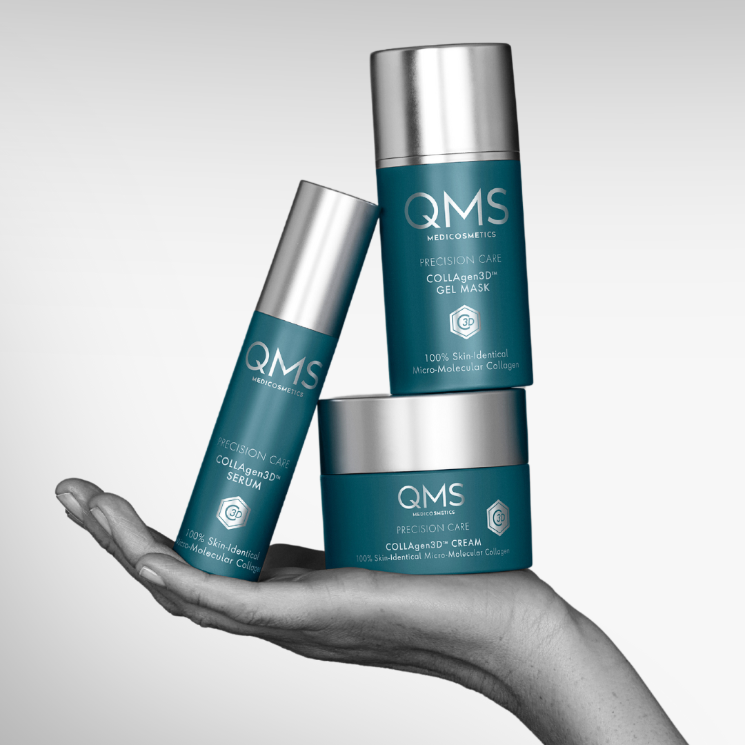 Sie bieten jedoch kein echtes Kollagen. Der Grund: Die biochemische Struktur unterscheidet sich zwischen Pflanzen und Tieren, dadurch war pflanzliches Kollagen bisher auch nicht hautidentisch. Mit COLLAgen3D™ aus der neuen Produktlinie PRECISION CARE von QMS nutzen wir das weltweit erste vegane, 100% hautidentische mikromolekulare Kollagen – die dritte Kollagen-Generation. Durch den Fermentationsprozess von Hefe werden keine tierischen Produkte mehr benötigt. Außerdem wird der Verbrauch von Energie-, Land- und Wasser in der Herstellung erheblich minimiert.